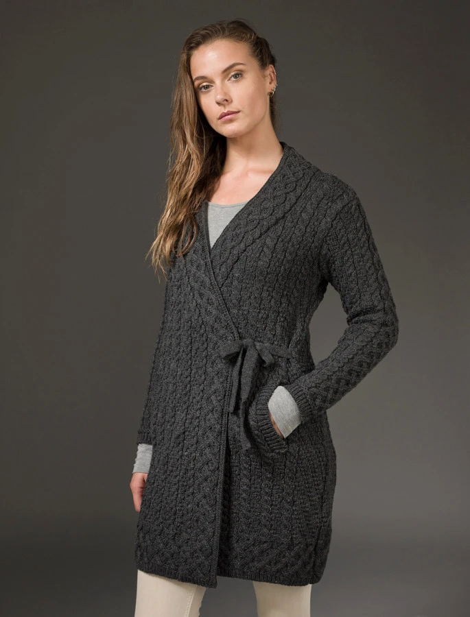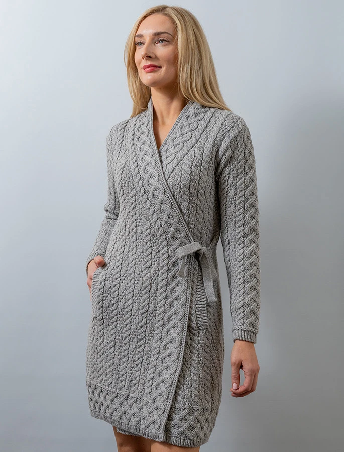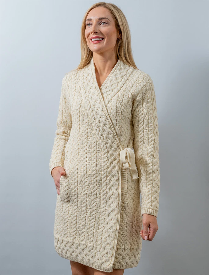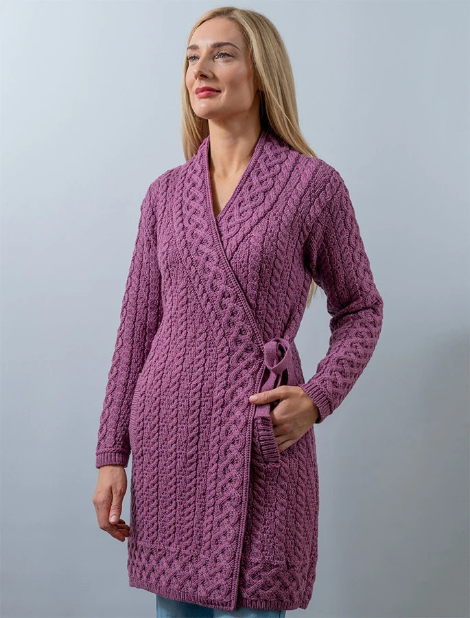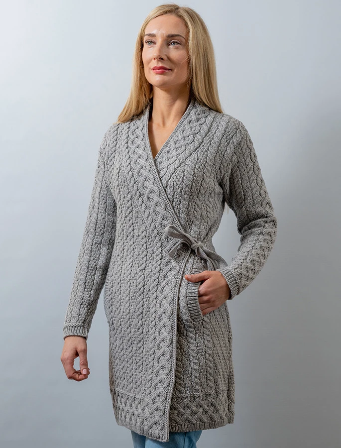 Our stunning Aran Wrap Cardigan is made with 100% pure new wool, a natural breathable fibre.