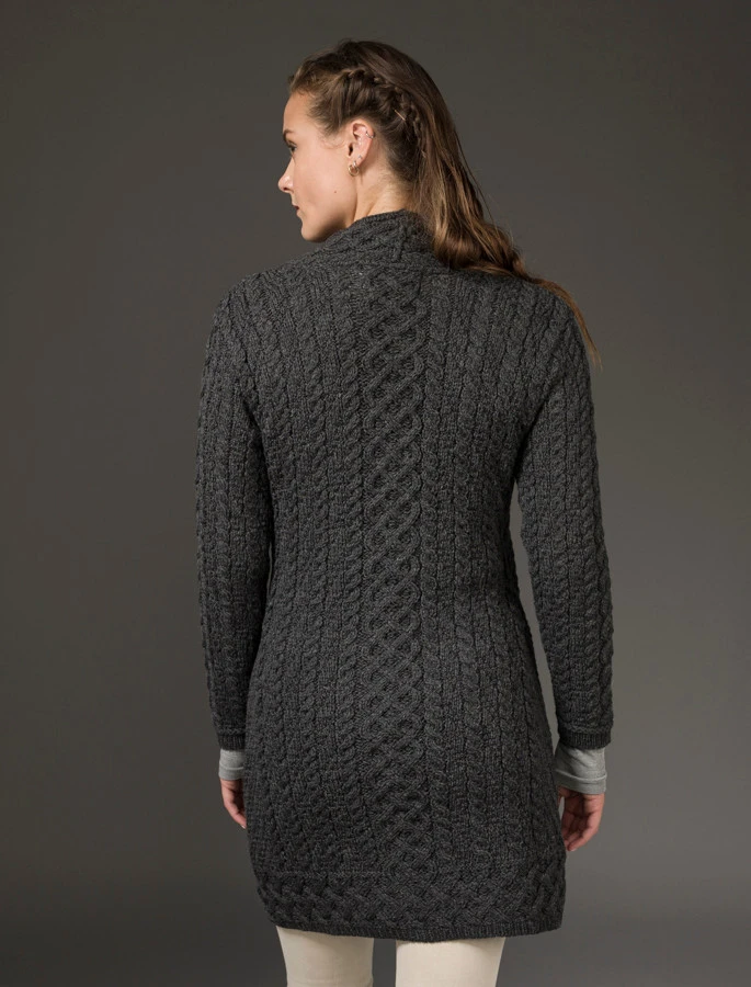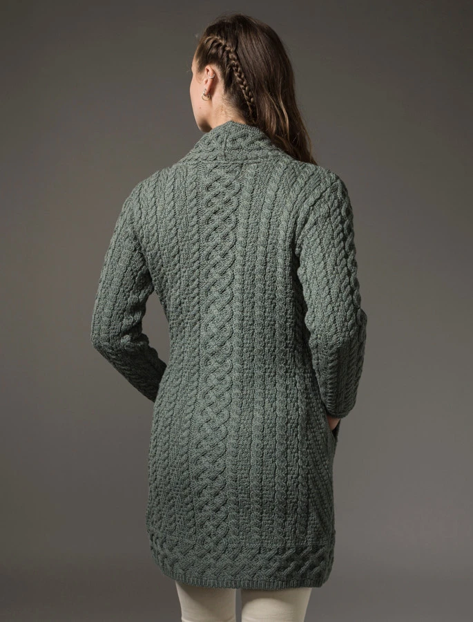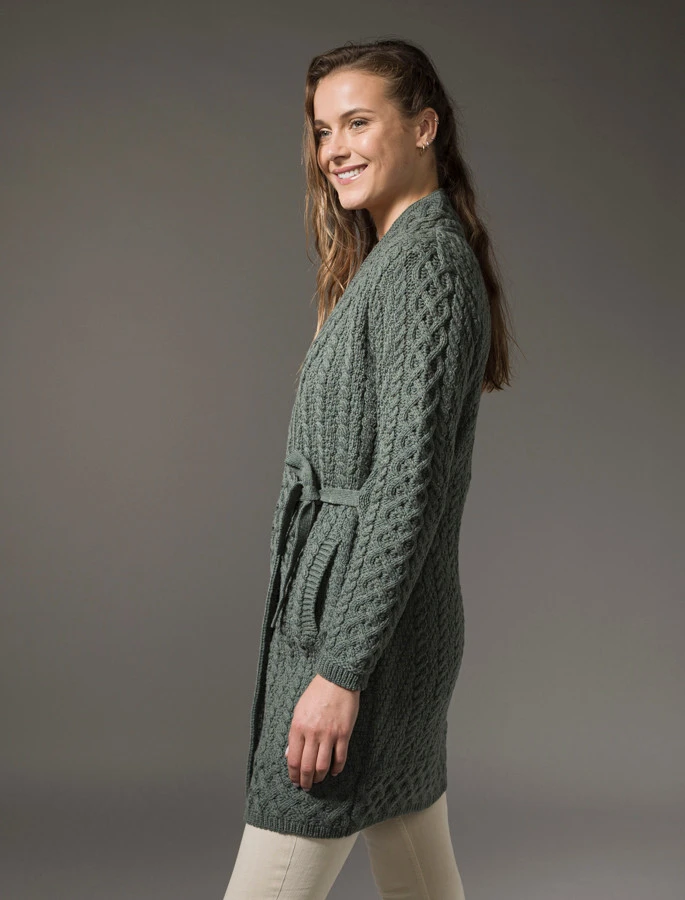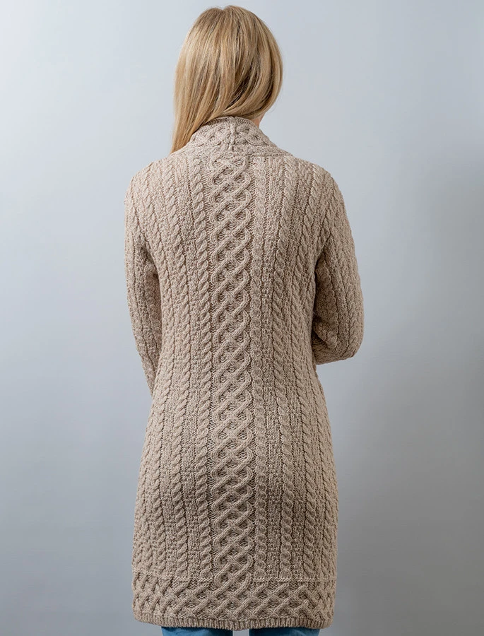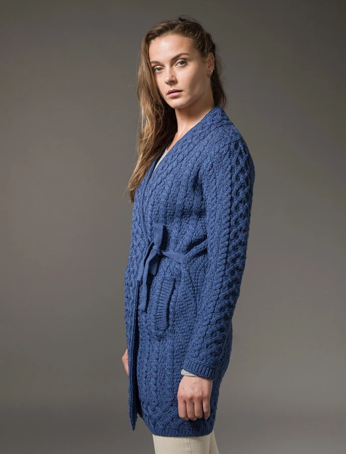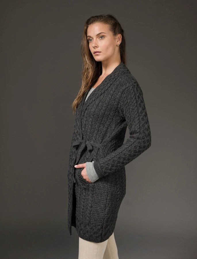 Our stunning Aran Wrap Cardigan is made with 100% pure new wool, a natural breathable fibre.