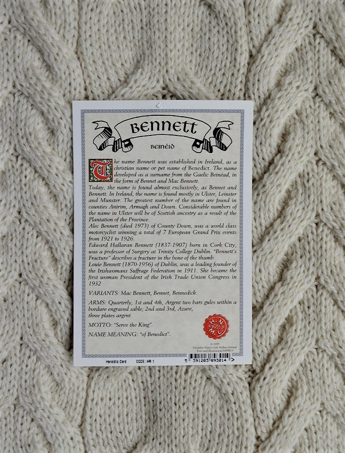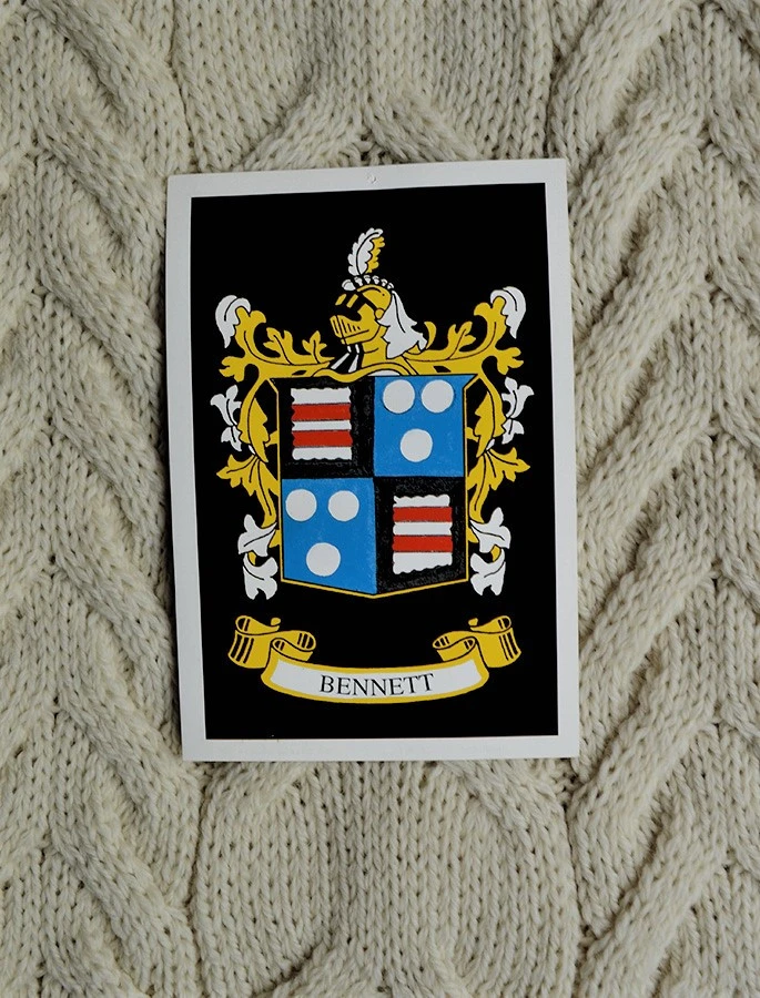 The Bennett Clan Aran Scarf is a wonderful item of Bennett heritage which will be cherished by the wearer for generations to come. Lovingly crafted from the finest 100% soft new wool, this Aran wool scarf has been created following the unique Bennett Clan Aran pattern.