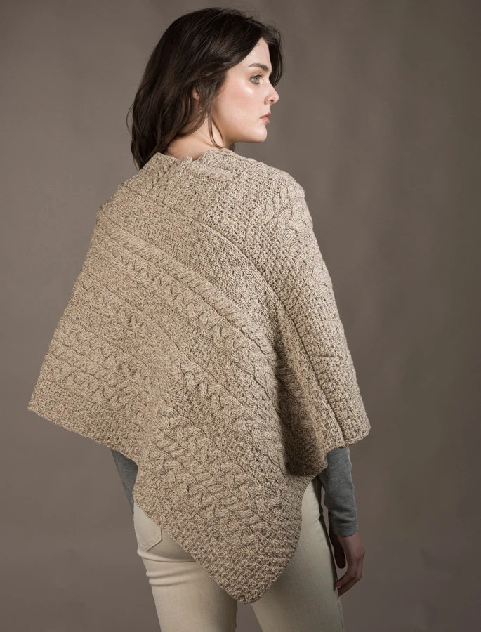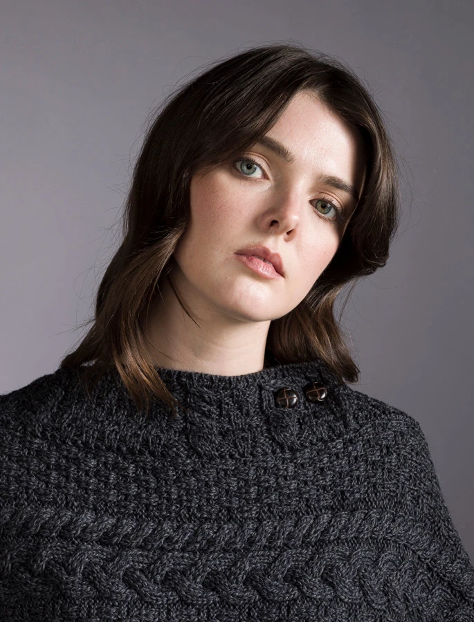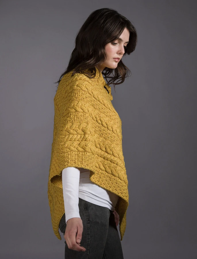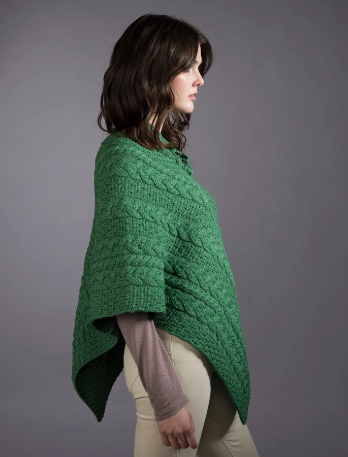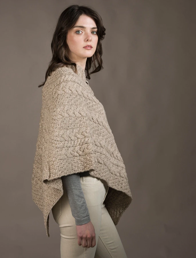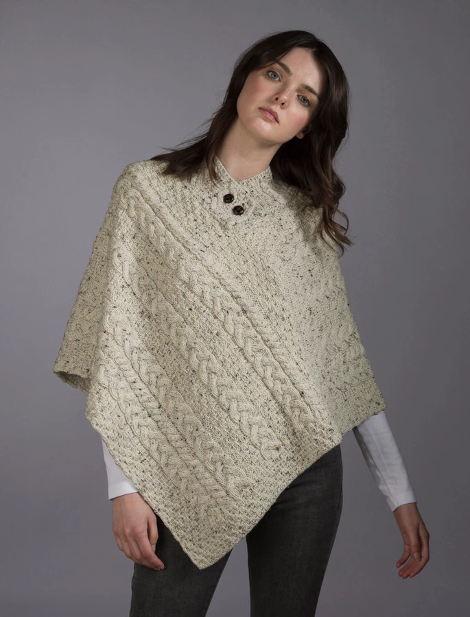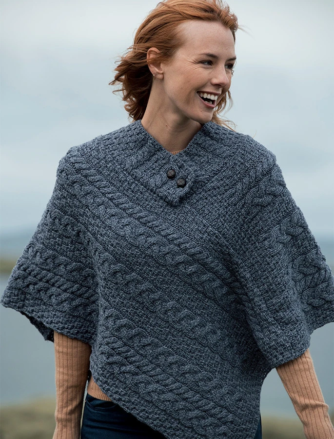 Our Cable Aran Poncho with Button Detail is a modern take on classic Irish design. This garment, while featuring delicate traditional Irish stitches, is the ideal companion for any woman as it is comfortable, practical and flattering for all body shapes.