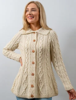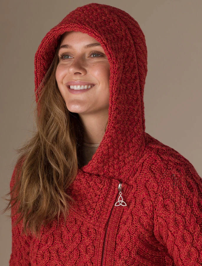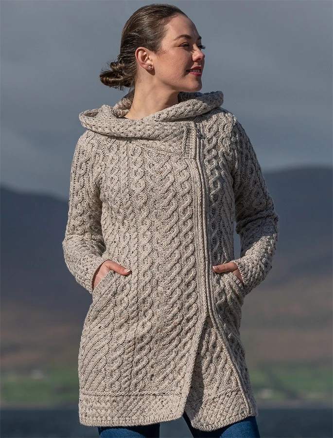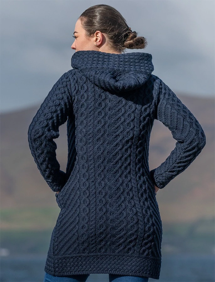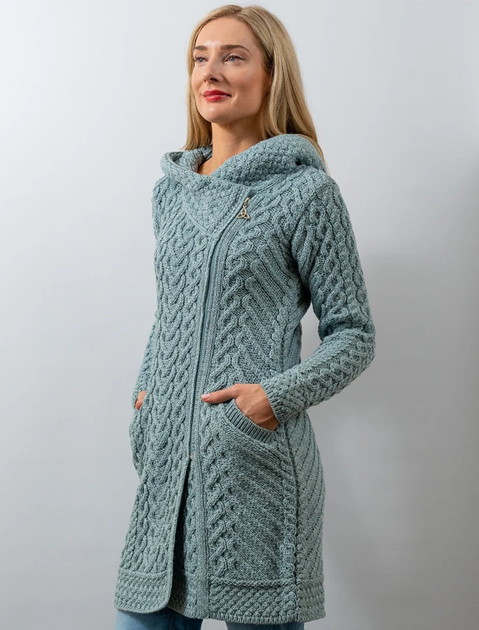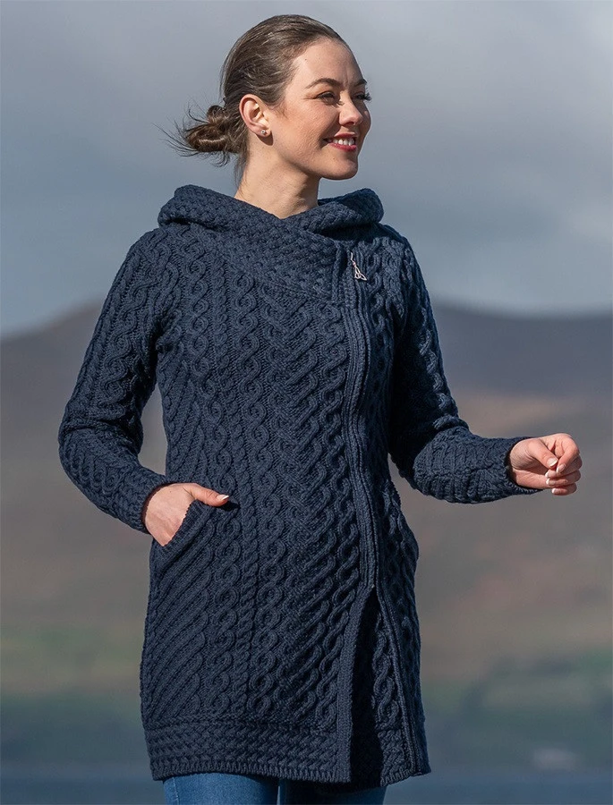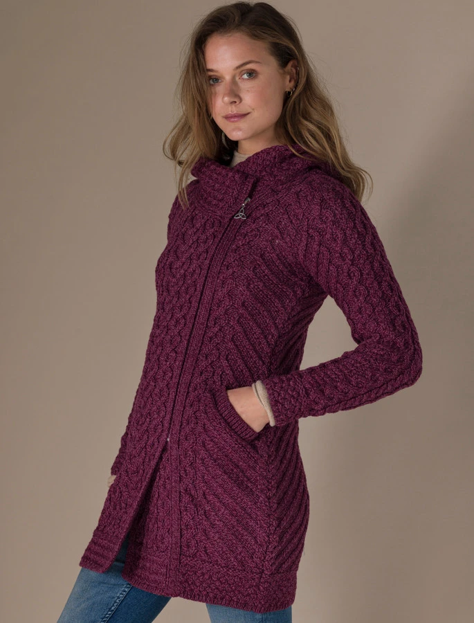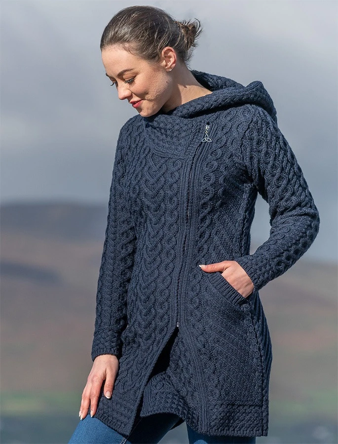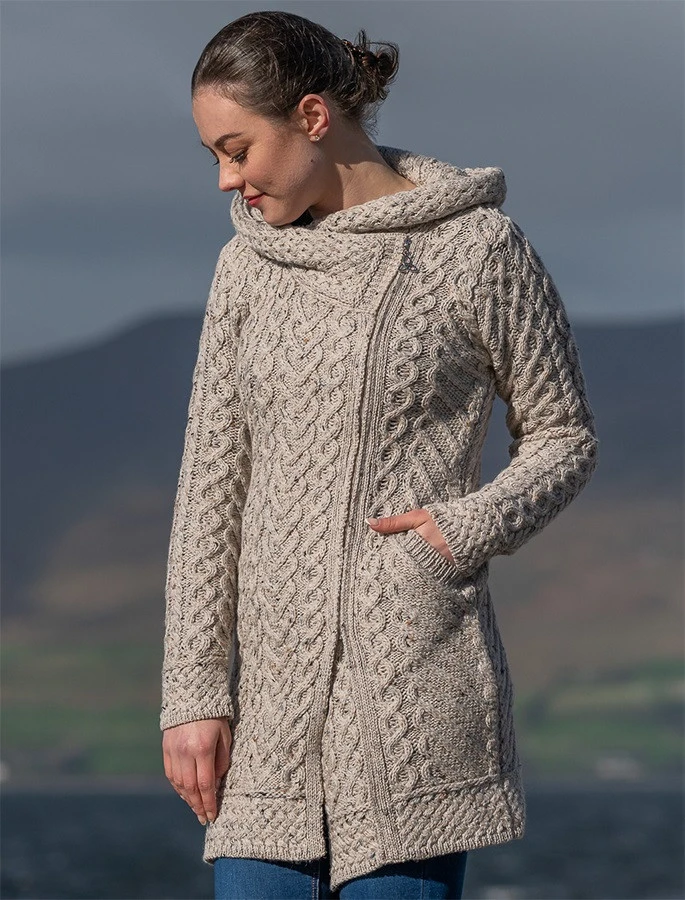 This Hooded Coatigan features a beautiful Claddagh heart design pattern flanked by traditional Aran cable stitches, resulting in a flattering and slimming effect.