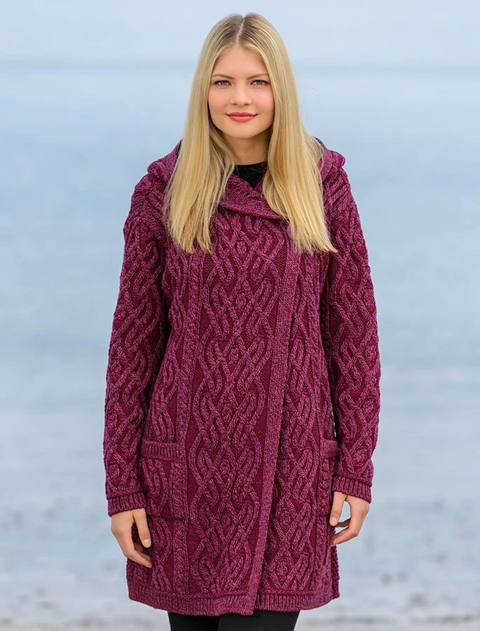 This plaited coat features an intricate Cable pattern in a downwards direction resulting in a flattering and slimming effect. Key features include one side button and a hood.