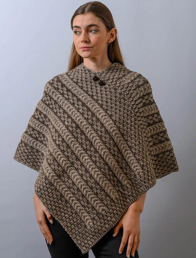 Our Plated Poncho with Button Detail is a modern take on classic Irish design. This garment, featuring delicate traditional Irish stitches, is the ideal companion for any woman as it is comfortable, practical and flattering for all body shapes.
